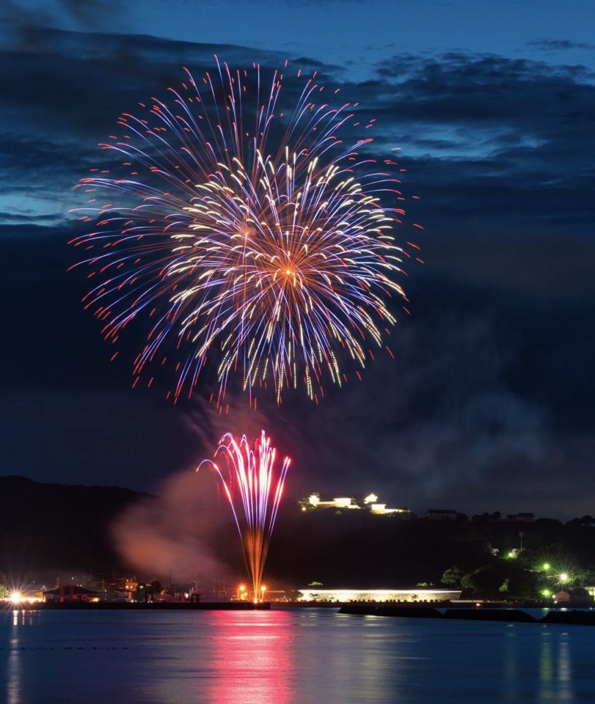 お一人目はニックネーム「dスケ」さん、タイトルは「富岡城に咲く」です🎆、「夕暮れから夜に変わる碧い空。海面に映る光と、山の上に見える城跡。そこに重なるように打ち上がる大輪の花火。」とエピソードもいただきました👍