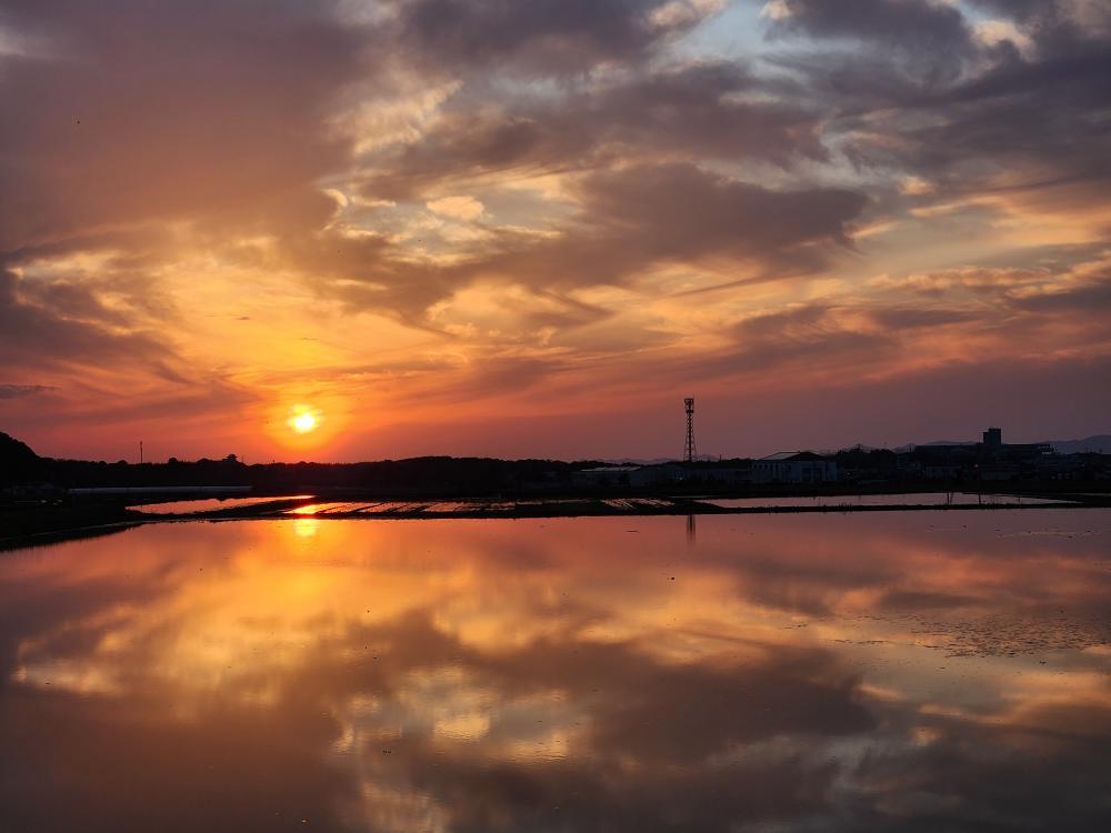 3人目はニックネーム「まなかん」さん、タイトルは「田植え前の水田に写る夕焼け空」で城下で撮られたお写真です。「田んぼに水を張って、田植え前で無風で水面が穏やかで、夕日がキレイな日にしか見られない、何もかもが揃ったときだけに見れる特別な風景です。毎年この風景を見れるのを楽しみにしてます。」とエピソードいただきました🎶